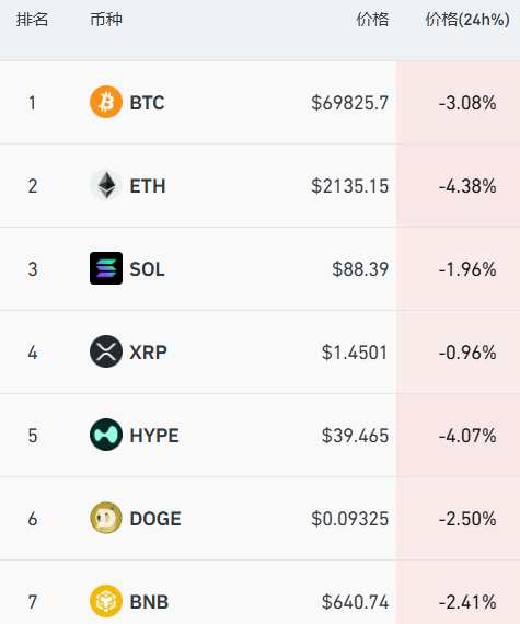 加密货币主要币种下跌,其中比特币跌超3%,跌破7万美元关口,过去24小时,全市场超14万人爆仓。