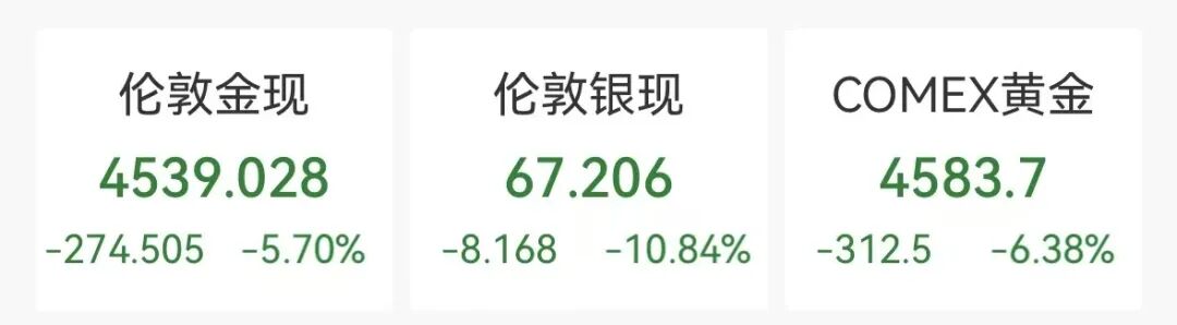 贵金属股全线大跌,New Pacific Metals、Endeavour Silver跌超13%,First Majestic Silver跌超11%,泛美白银、科尔黛伦矿业跌超10%,埃氏金业、金罗斯矿业、纽曼矿业跌超9%,哈莫尼黄金跌超8%。消息面上,今晚黄金白银跳水幅度还在扩大,现货黄金跌超5%,报4539美元/盎司。现货白银日内跌幅超10%,报67.2美元/盎司。