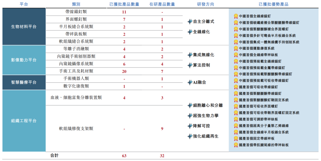 截至最后实际可行日期,公司的产品组合包括63种产品,涵盖植入物、手术设备及相关耗材及手术工具以及再生修复产品。