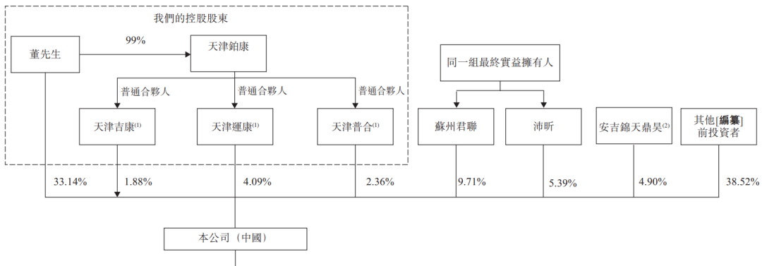 董先生、天津吉康、天津普合及天津运康分别持有公司33.14%、1.88%、2.36%及4.09%股份。同时,董先生持有天津铂康99%股份,并通过担任GP的形式控制天津吉康、天津普合及天津运康。因此,董先生、天津铂康、天津吉康、天津普合及天津运康构成公司控股股东,合计持股约41.47%。