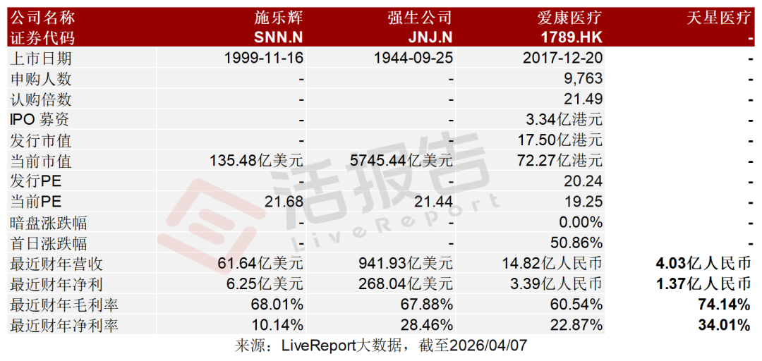 同行业IPO可比公司:施乐辉(SNN.N)、强生公司(JNJ.N)、爱康医疗(1789.HK)