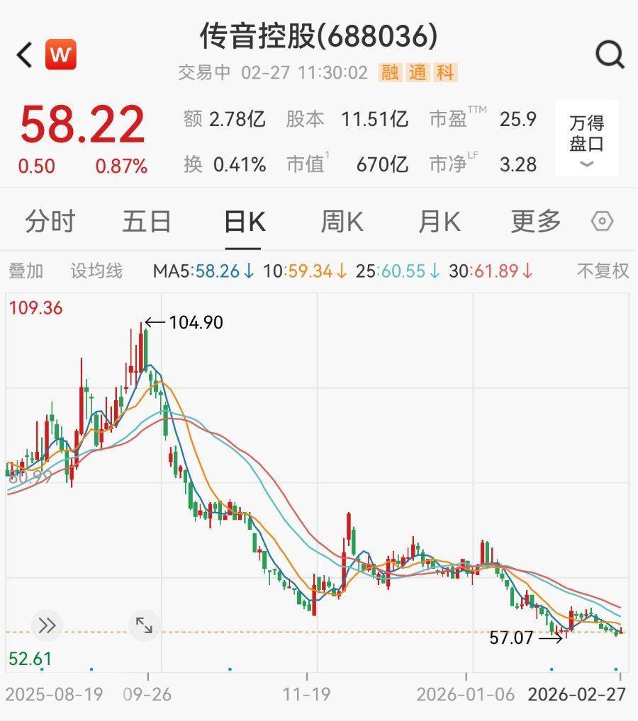截至2月27日午间收盘,传音控股(688036.SH)涨0.87%股票极速配资开户靠谱吗,报58.22元/股,总市值为670.2亿元。该公司股价自2025年9月触及104.90元/股后,便进入下行通道,至今累计跌近40%。